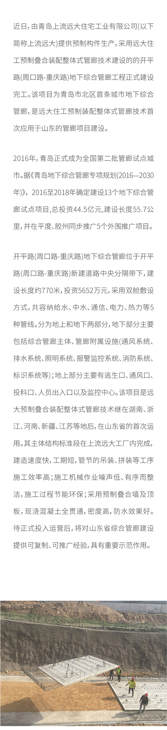 遠大住工預制裝配整體式管廊技術在山東首次應用 開平路(周口路-重慶路)地下綜合管廊項目建成完工